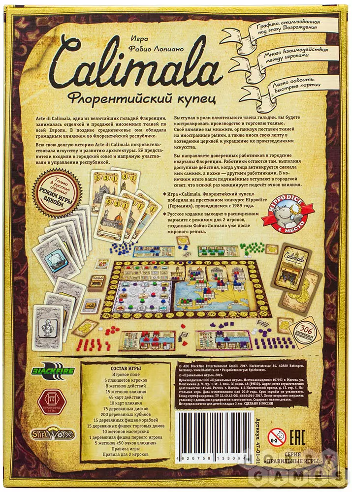 Именно таким влиятельным вельможей вам предстоит стать в настольной игре "Calimala. Флорентийский купец". Вступите в увлекательное соревнование за влияние в гильдии! Займитесь управлением вашим предприятием, контролируйте все процессы от производства до отправки конечному покупателю. Заработайте репутацию и известность европейского масштаба, вкладывайтесь в постройку мастерских и жертвуйте деньги на возведение храмов. Флоренция заслужила себе достойного официального представителя!