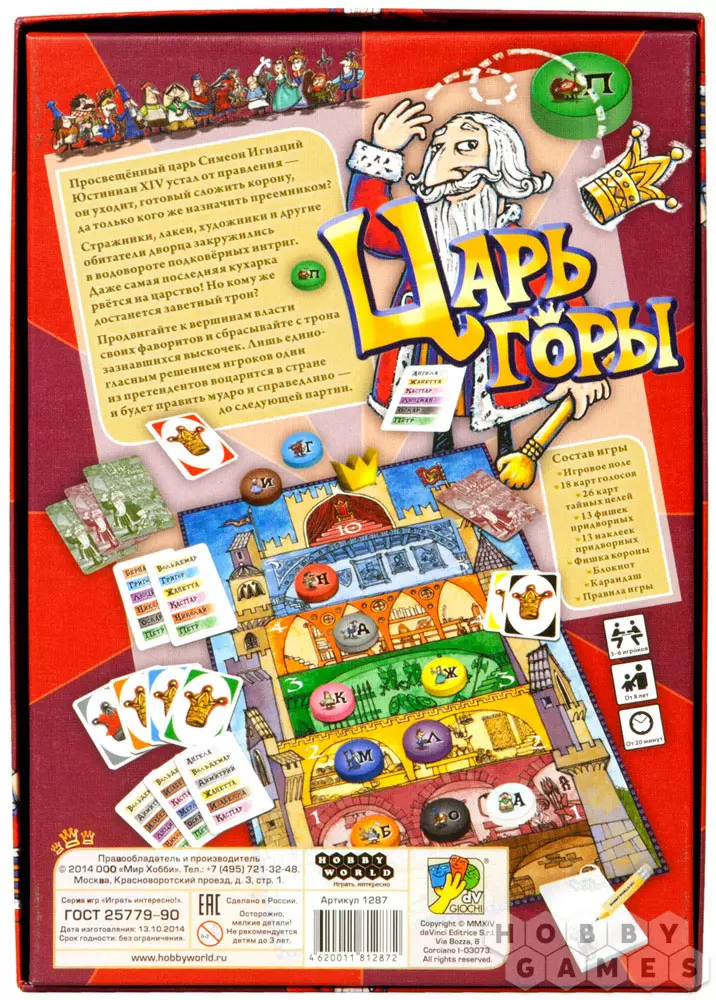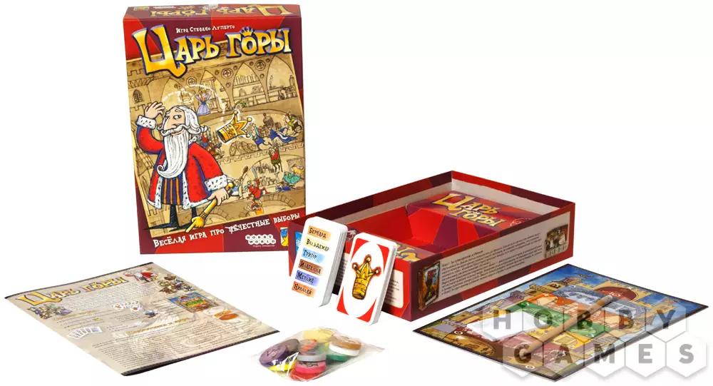 Великий Царь Симеон Игнаций Юстиниан XIV собрался уйти на покой, а правление отдать некому... Тут-то и разгораются нешуточные придворные страсти. Все, начиная от поварят и заканчивая художниками, хотят попытать свою удачу и оказаться на троне. И только Вы можете разрешить спор, разгоревшийся в настольной игре "Царь Горы". Продвигайте своих фаворитов всё выше и выше, не вызывайте подозрения у соперников, выводите своих людей на высокие посты... И пусть победит сильнейший!
