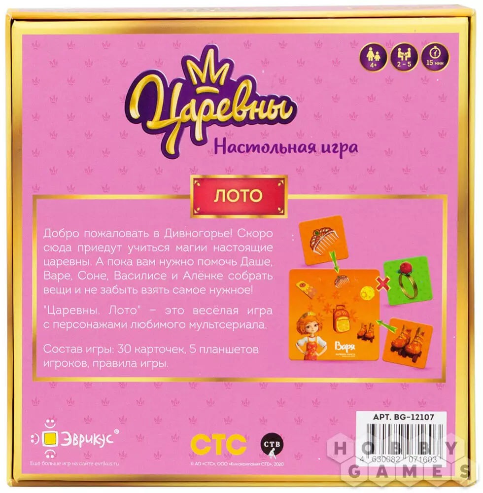 "Царевны. Лото" – классическая игра, посвящённая любимым героиням "Царевен": Василисе, Алёнке и другим. Вам нужно будет выбрать себе планшет с той из них, которая больше приходится по душе, и помочь девочке собрать её вещи. Для игры вдвоём стоит взять по два таких планшета, а то будет скучновато! Вам нужно будет внимательно вглядываться в картинки, по очереди переворачиваемые всеми игроками, и забирать себе те, которые есть у вас на планшете. Тот, кто собрал все картинки со своего планшета – побеждает, но всегда тщательно проверяйте, точно ли все картинки совпадают. Есть отличия? Тогда игра продолжается!