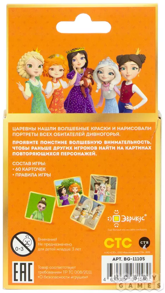 В этой весёлой карточной игре есть два варианта правил: "Кто быстрее?", где игроки совместно собирают цепочку из своих карточке, ориентируясь на совпадающие картинки, и "Каверзы Бабы Яги", где нужно как можно скорее и больше накрывать ладонью карточки с повторяющимся портретом, но при этом не попасться на уловки хитрой Бабы Яги. Эта игра точно придётся вам по вкусу, если в глубине души вы чувствуете себя царевной!