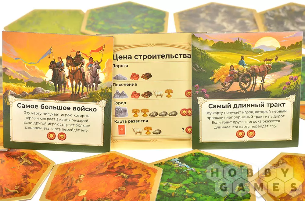 Игроки начинают с двумя Дорогами и двумя Поселениями, а выбор их местоположения принадлежит игроку. Таким образом, вы начинаете с 2 победными очками (ПО), цель же игры проста – набрать 10. Помните, что Города (2 ПО) возникают там, где уже есть Поселения (1 ПО), а Поселения можно построить только на Дороге. На любое строительство тратятся ресурсы, которых всегда не хватает. Тут вас может выручить торговля – обмен ресурсами это жизненная необходимость, ведь вы будете получать только сырьё определённых видов, с тех земель, где находятся ваши Поселения и Города. А гекс, где стоит Разбойник – вообще не приносит ресурсов... Чуть подробнее: