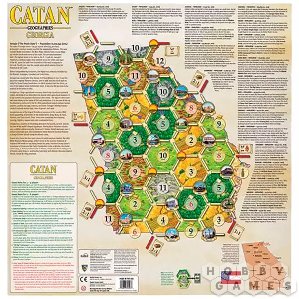 Catan Geographies: Georgia – дополнение с альтернативными картами и правилами, которые добавят разнообразия вашей игре. Участникам необходимо заселить дебри Джорджии, богатые ресурсами. Проконтролируйте суконную и бумажную промышленность и соберите победные очки раньше других. Пусть "Персиковый штат" станет новым местом силы и жизни!