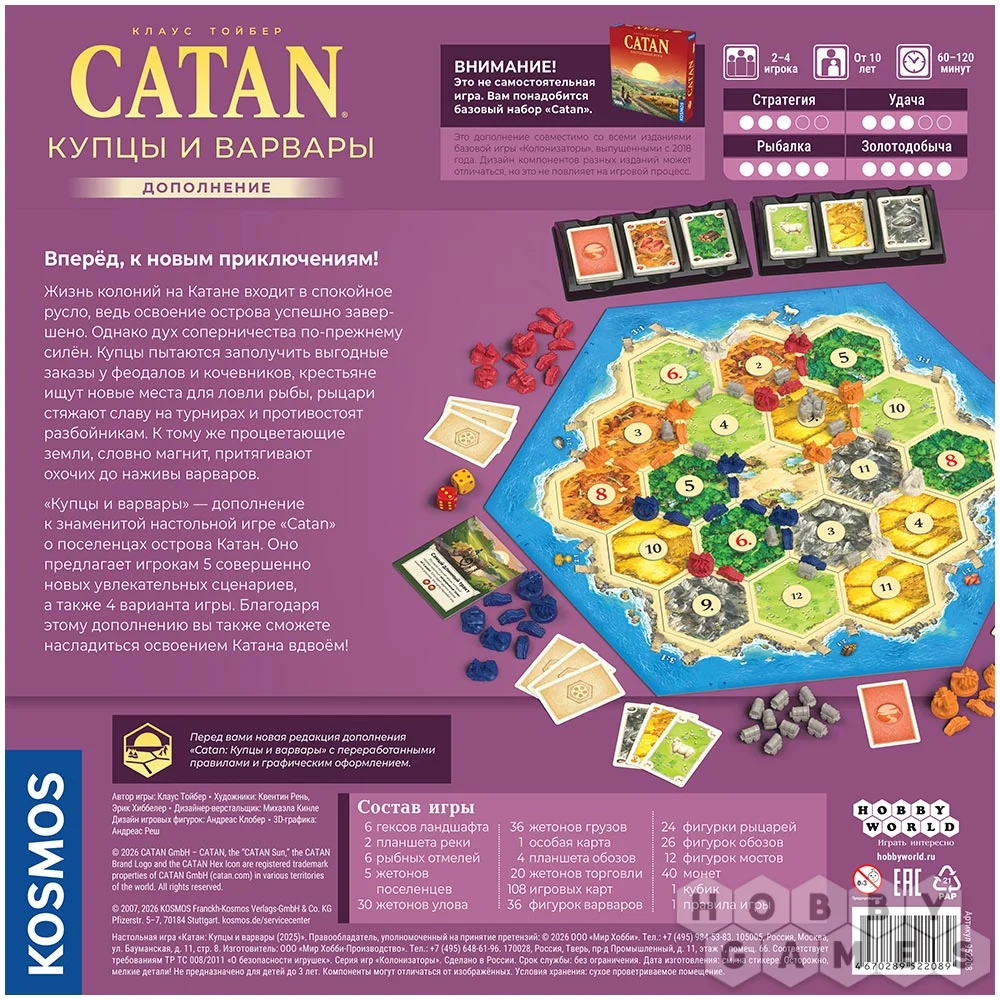 Дополнение "Купцы и варвары" – это расширение для настольной игры "Catan. Колонизаторы", которое позволяет разнообразить стандартных "Колонизаторов" за счёт пяти новых сценариев. Одно из ключевых нововведений – замена броска кубиков специальной колодой "Происшествия на Катане": карты из неё запускают неожиданные события, например получение или перераспределение ресурсов. Также дополнение включает детально проработанный режим для двух игроков.