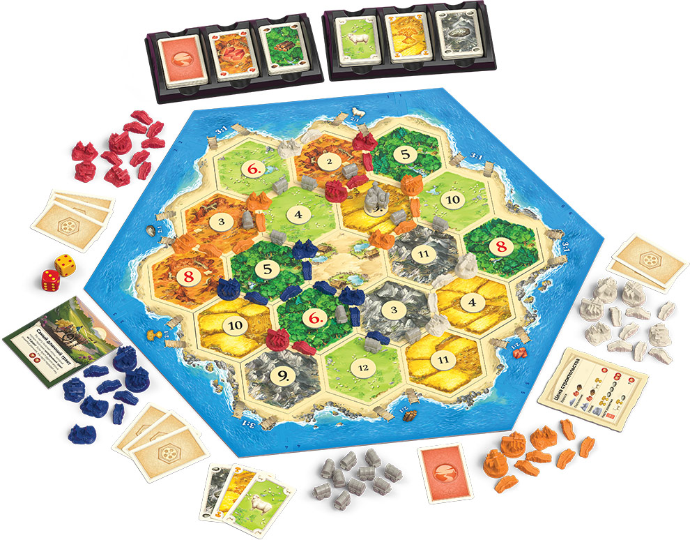 Игроки начинают с двумя Дорогами и двумя Поселениями, а выбор их местоположения принадлежит игроку. Таким образом, вы начинаете с 2 победными очками (ПО), цель же игры проста – набрать 10. Помните, что Города (2 ПО) возникают там, где уже есть Поселения (1 ПО), а Поселения можно построить только на Дороге. На любое строительство тратятся ресурсы, которых всегда не хватает. Тут вас может выручить торговля – обмен ресурсами это жизненная необходимость, ведь вы будете получать только сырьё определённых видов, с тех земель, где находятся ваши Поселения и Города. А гекс, где стоит Разбойник – вообще не приносит ресурсов... Чуть подробнее: