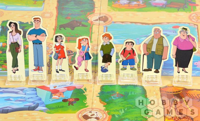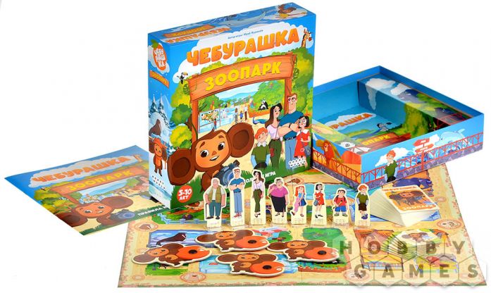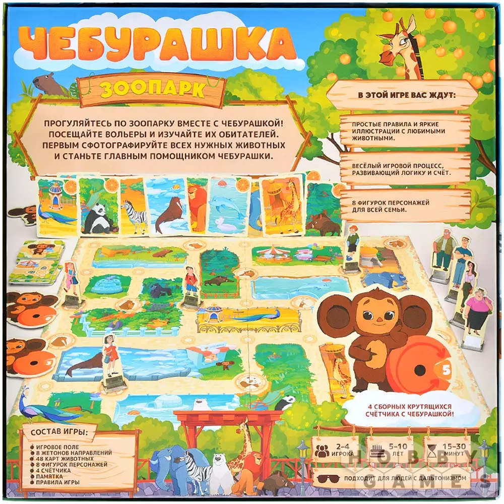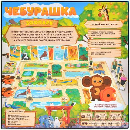 "Чебурашка: Зоопарк" – лёгкая и динамичная игра-бродилка для детей, которая перенесёт вас в мир доброго мультфильма. Игроки выбирают одного из восьми персонажей и отправляются исследовать зоопарк, посещая разнообразных животных. Ваша задача – быстрее всех находить нужных зверей и делать их фотографии. Это не только увлекательно, но и полезно – игра развивает внимательность, пространственное мышление, учит счёту. Простые правила делают игру доступной даже для самых маленьких настольщиков, а яркое оформление и объёмные фигурки добавляют ей очарования!