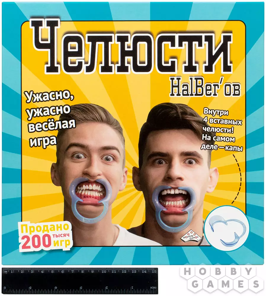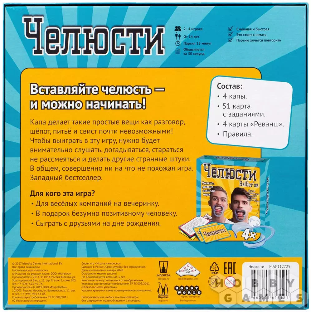 В весёлой настольной игре "Челюсти" вам предстоит выполнять различные задания, например, произнести какую-либо фразу, съесть банан, выпить стакан воды или объяснить словосочетание, но всё усложняется тем, что во рту у игроков размещаются специальные пластиковые капы. И вот здесь и начинается самое интересное, потому что сделать всё это, кажущееся на первый взгляд простым, будет очень и очень непросто! Карты с заданиями отличаются по цвету, который указывает на особенность выполнения заданий, а также на получение победных очков. Также в игре присутствуют карты "Реванш", которые можно использовать в том случае, если в дуэльном "красном" задании не получилось одержать верх. Такая карта даёт возможность повторить испытание.