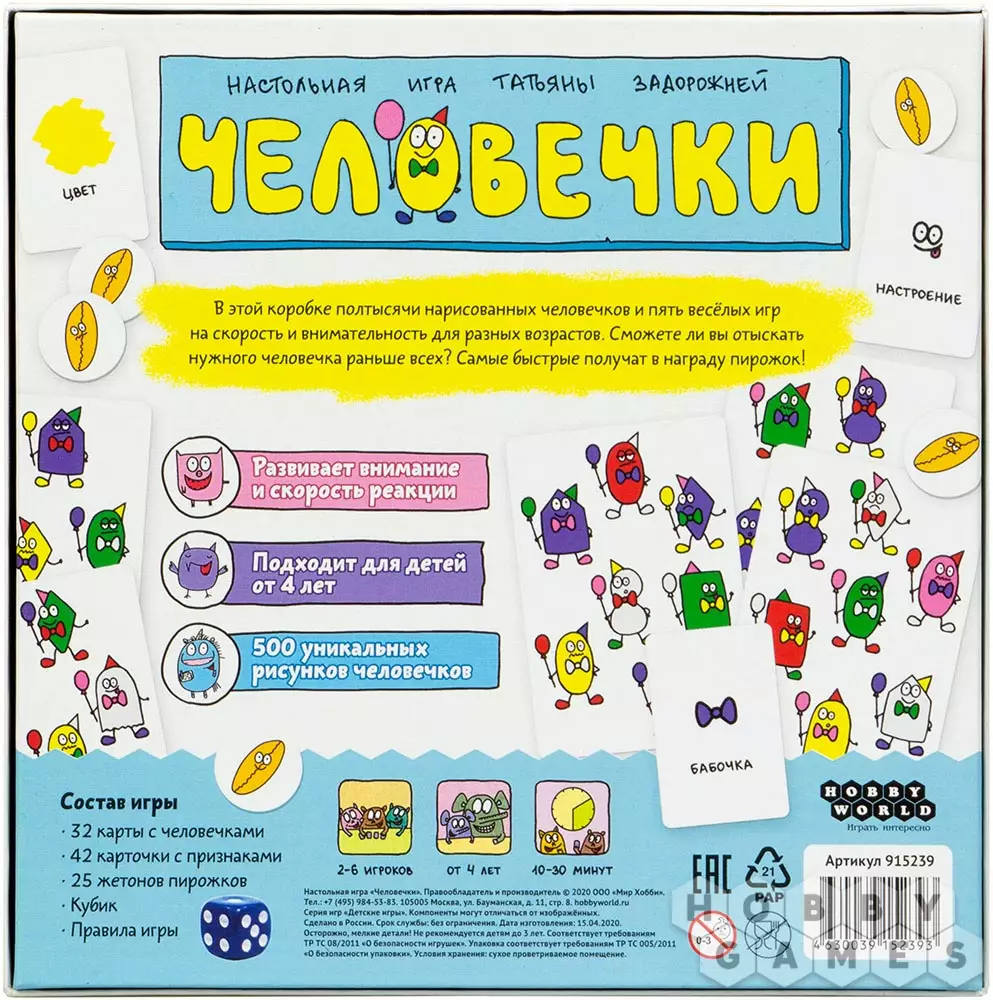 Вас ждёт не одна игра, а целых пять, причём и на этом можно не останавливаться, а придумать свои собственные правила, тут уж куда фантазия приведёт. Однако, все варианты игры объединяют общие принципы, которых всё-таки нужно придерживаться. Самое главное – запомнить, что у каждого из множества человечков, притаившихся в коробке, есть отличительные признаки, а именно: то, что на нём надето, что он держит в руках, а также его собственный цвет, форма и настроение.
