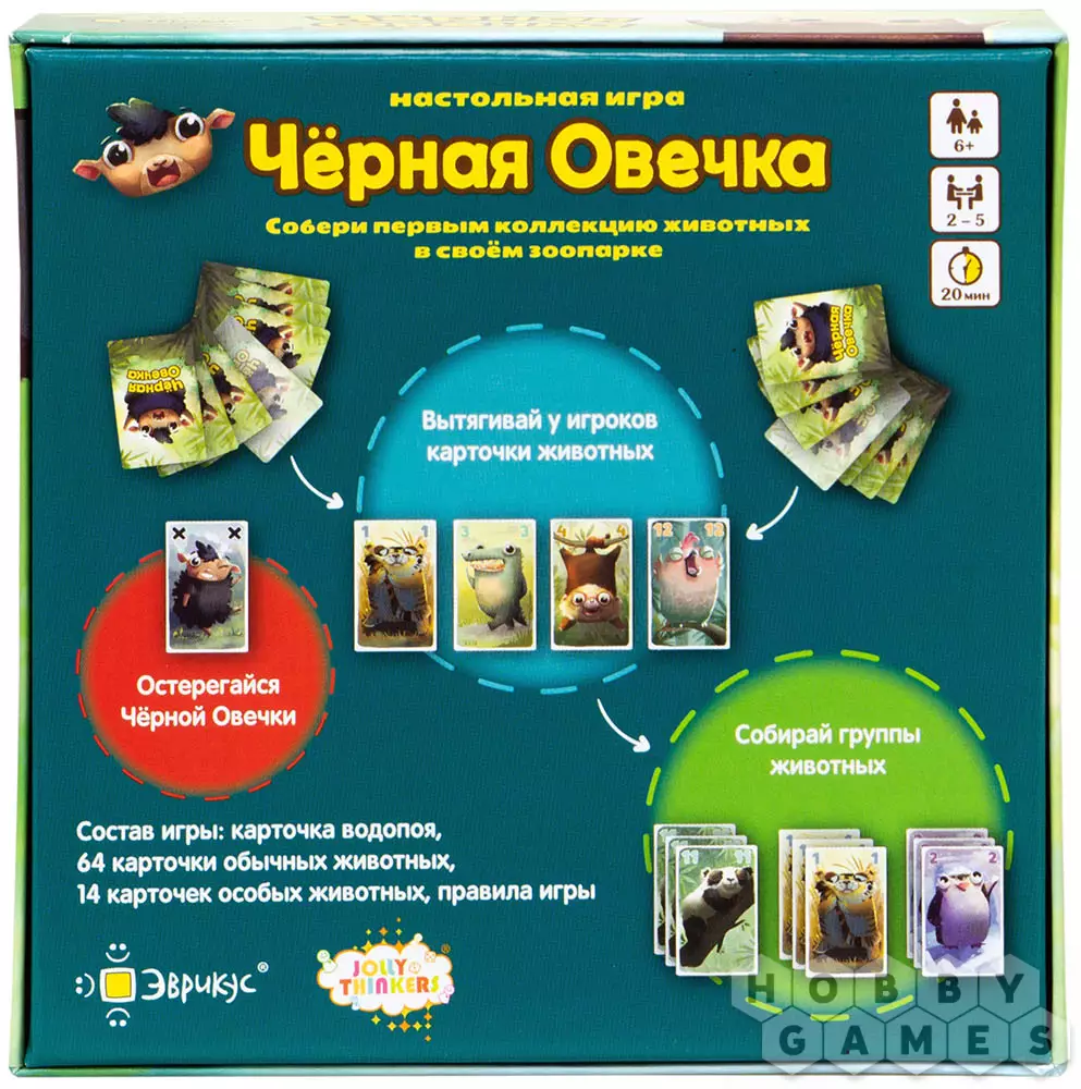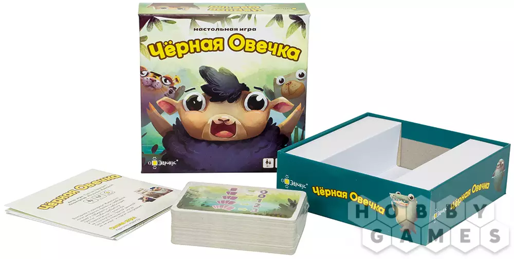 "Чёрная овечка" – увлекательная настольная игра с простыми правилами и яркими иллюстрациями. Игрокам для победы нужно вытягивать у соперников карточки, собирая в своей руке группы животных. Но остерегайтесь черной овечки – она рушит все планы и передаёт ход следующему игроку! Не отчаивайтесь, вам на помощь всегда могут прийти особые животные, которые своими умениями приблизят вас к победе.