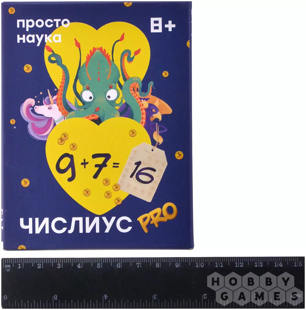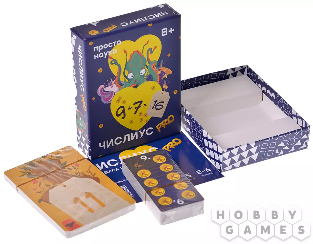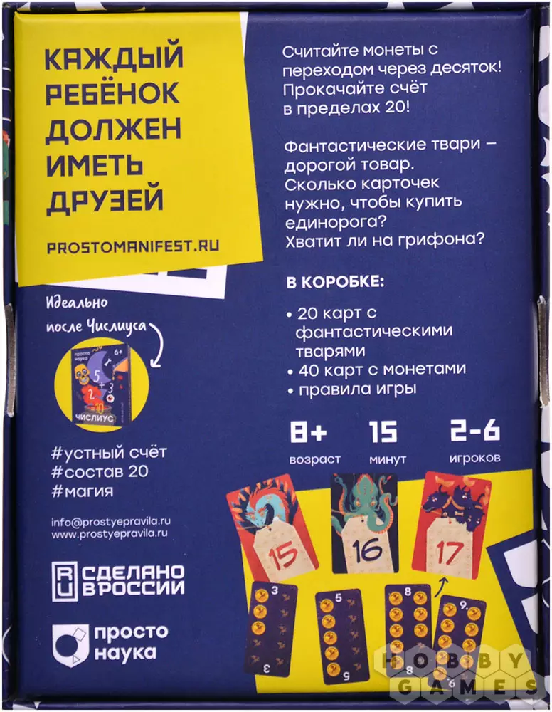 Игра "Числиус PRO" перенесёт вас в волшебный магазин! Здесь продаются фантастические существа – единороги, грифоны, кракены и многие другие. Все они обладают разной стоимостью – и для того, чтобы купить магического зверька, вам придётся выложить две (и не больше!) карты монет, суммарный номинал которых равен его стоимости. Проблема в том, что игроки действуют одновременно – придётся считать быстро и точно!