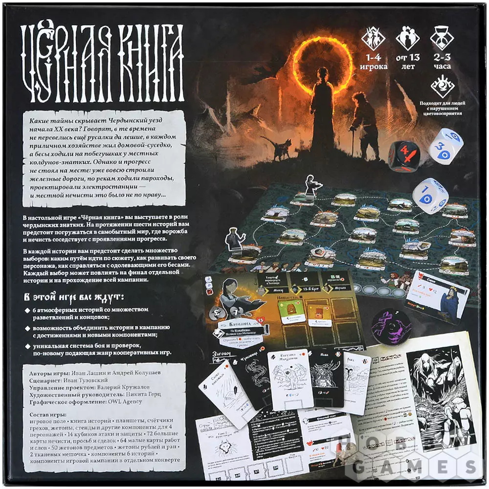 "Чёрная книга" – это кооперативная игра в славянском сеттинге, действие которой происходит в последние годы XIX века в Чердынском уезде Российской империи, после событий одноимённой видеоигры. Вы возьмёте на себя роли знатких – колдунов, которые владеют таинственной силой Чёрной книги. Вас ждут 6 увлекательных историй, которые откроют вам мир, где удивительным образом сочетаются древнейшее колдунство и зачатки технического прогресса, дошедшего до страны. Следуйте плетению сюжета, но творите собственную историю – принимайте непростые решения, развивайте своего героя и знакомьтесь ближе с обитателями Чердыни – от людей до различных существ, его населяющих.