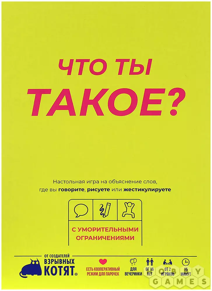 "Что ты такое?" могла стать очередной игрой на объяснение слов разными способами, при взгляде на которую в голове появлялся бы вопрос, украшающий коробку. Но она не стала! А всё благодаря своей изюминке – забавным ограничениям, превращающим игровой процесс в театр абсурда и нескончаемой уморы. Вот представьте: вы вытянули карту задания, а она говорит вам объясняться рисунком, НО В ПРОЦЕССЕ ВАША ГОЛОВА ДОЛЖНА ЛЕЖАТЬ НА СТОЛЕ. Или вы должны объяснить слово жестами, НО В ЭТО ВРЕМЯ ВЫ ОБЯЗАНЫ КРУЖИТЬСЯ ВОКРУГ СЕБЯ ВСЁ ВРЕМЯ. Звучит безумно, не правда ли? А выглядит ещё безумнее и смешнее, отчего в голове и возникает тот самый вопрос: да что же ты такое?