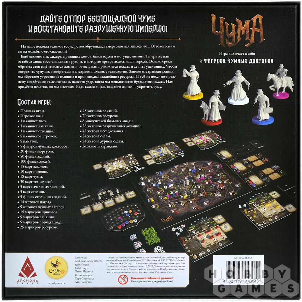 "Чума" – это атмосферная кооперативная настольная игра, в которой вы отправляетесь в охваченный бедствием город, чтобы спасти его от надвигающейся гибели. Игроки управляют персонажами с уникальными способностями, исследуют локации, ищут улики и сталкиваются с ужасами, подтачивающими не только тела, но и волю. Механика игры построена на сценариях с нелинейным развитием, где каждое ваше действие влияет на то, каким будет финал.