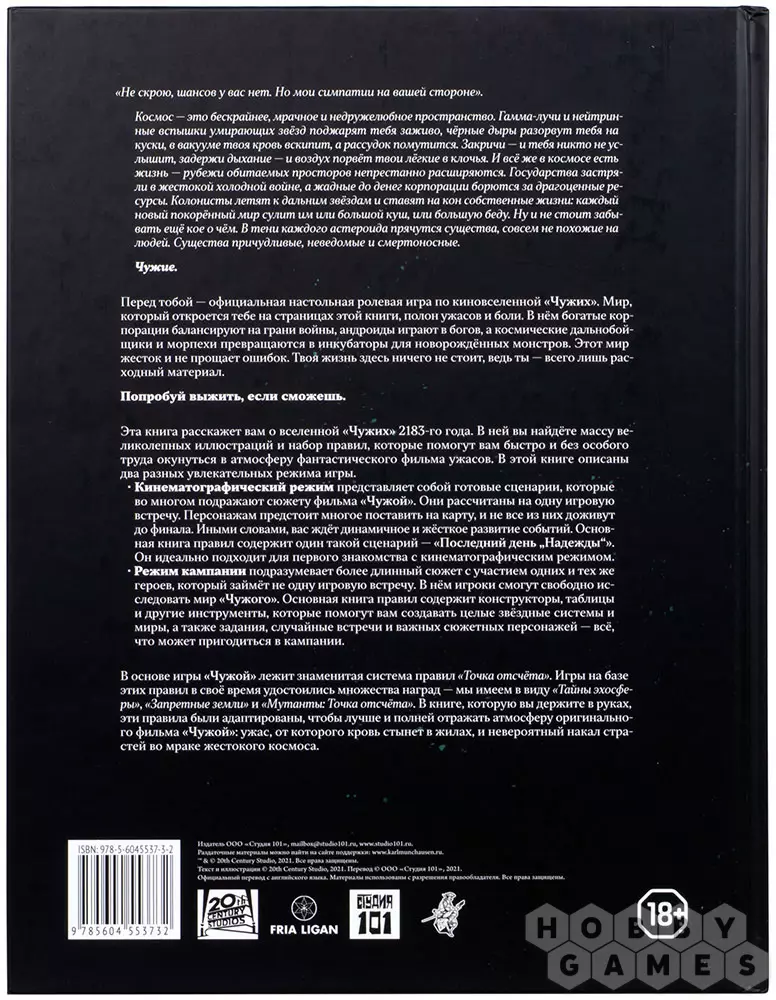 Откройте для себя официальную настольную ролевую игру по культовой вселенной, основанной на фильме "Чужой". Вы можете играть как в режиме кампании, так и в кинематографическом режиме. Для каждого из них существуют свои фрагменты правил, относящиеся только к этому режиму. В кинематографическом сценарии события протекают стремительно, подразумевая выяснение отношений между игроками и неизбежную гибель многих из них. В режиме кампании, в отличие от кинематографического, дело не обойдётся единичной встречей. Создав собственных персонажей, участники будут играть снова и снова, в очередной раз собираясь за столом. В режиме кампании шанс выжить гораздо выше, ведь сюжет рождается благодаря решениям ведущего и самих игроков.