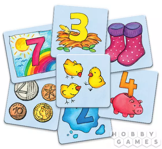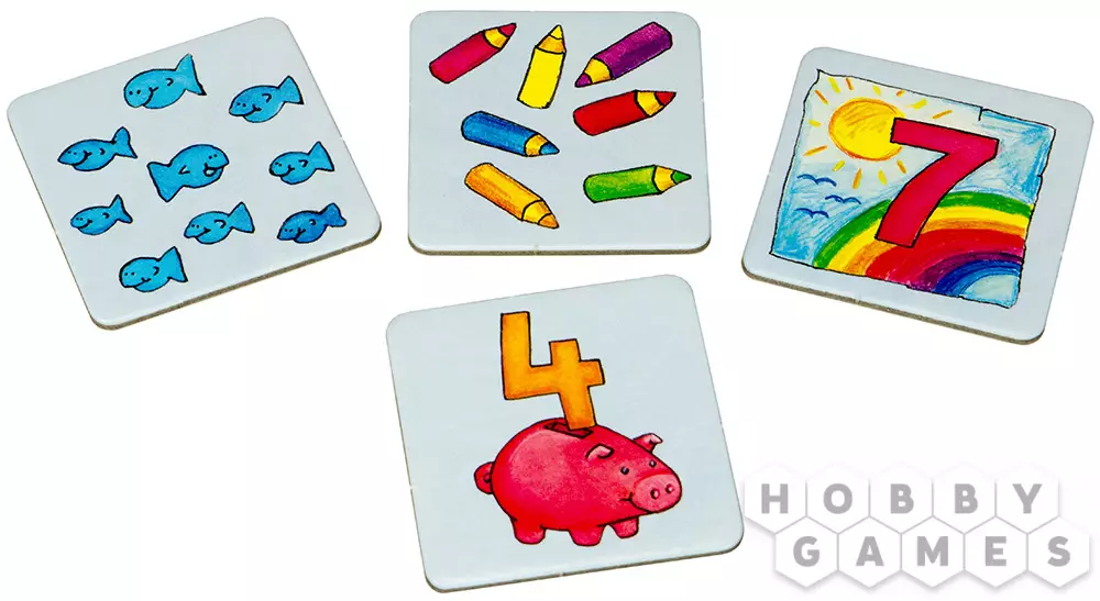 Игровые жетоны выкладываются лицом вниз таким образом, чтобы получился квадрат 5х5. В игре есть три типа жетонов: это цифровые жетоны, жетоны с определённым количеством предметов на них, и жетоны Цифрозаврика. Игрокам необходимо открывать жетоны и проверять, получилась ли у них пара. Парой являются жетоны предметов и чисел, например, на одном жетоне изображена цифра "7", а на другом семь цветных карандашей. Ребёнку необходимо знать цифры и уметь считать предметы на жетонах, чтобы сопоставить их.