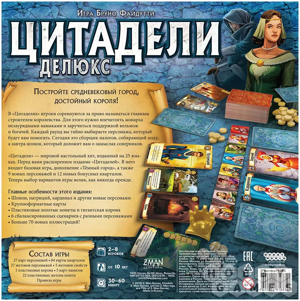 "Цитадели" – это всемирно известная настольная игра Бруно Файдутти, увидевшая свет в далёком 2000 году и переведённая на данный момент уже на 25 языков. В целом, игру можно описать как карточную градостроительную настольную игру, но на самом деле "Цитадели" абсолютно уникальны и сочетают в себе сразу несколько жанров, включая психологическую игру. По ходу партии игроки получают золото, выбирают себе на руку карты кварталов, а затем могут производить застройку, покупая эти самые кварталы за золото. Цель игры – построить самый престижный, то есть самый дорогой город.