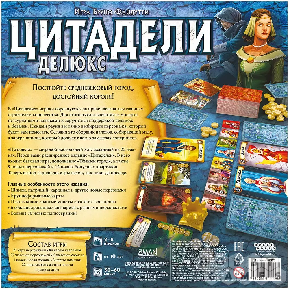 "Цитадели. Делюкс" представляют собой дополненное и переработанное издание, которое включает полностью перерисованные карты (более 70 штук) увеличенного размера и новый дизайн. Данная версия включает в себя восемь базовых персонажей, десять персонажей из дополнения The Dark City, а также девять абсолютно новых. Помимо этого, многие элементы и персонажи были переработаны, чтобы обеспечить интересный, яркий и сбалансированный игровой процесс.