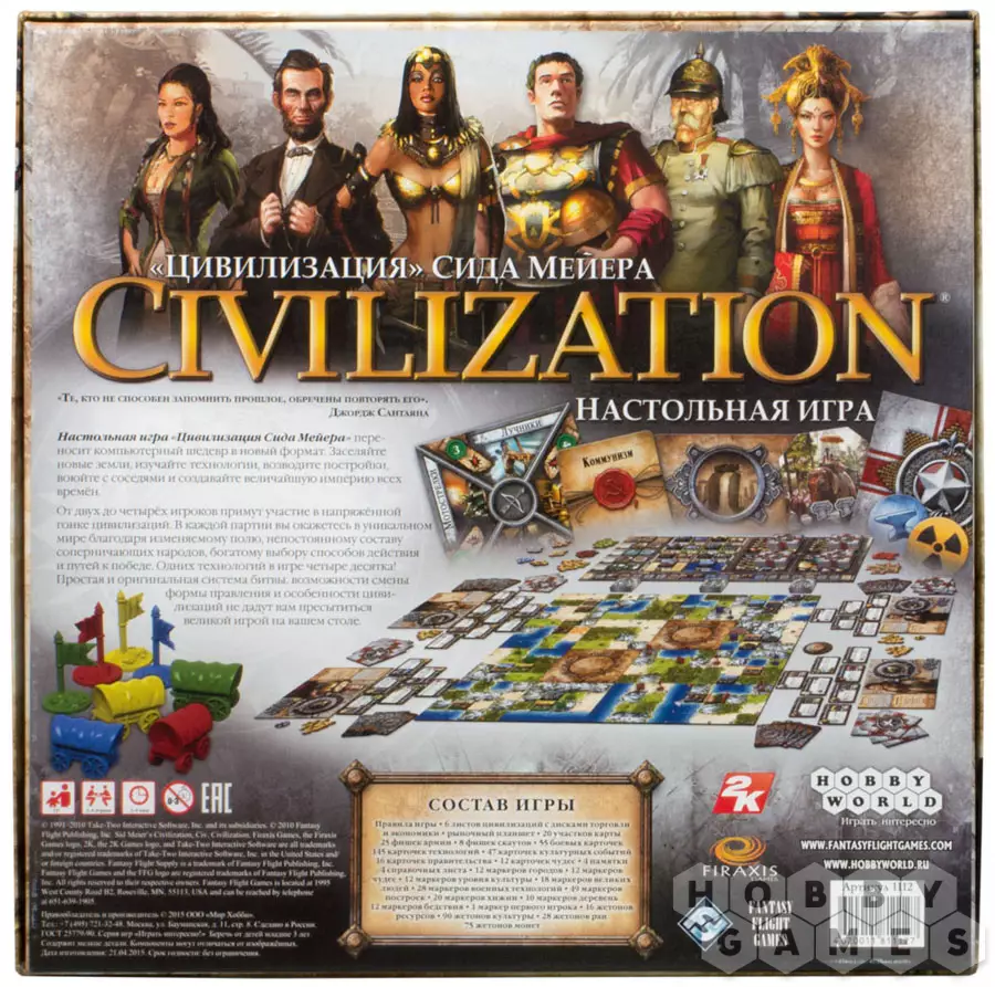 В настольной игре "Цивилизация Сида Мейера" от 2 до 4 игроков берут на себя роли великих лидеров исторически реальных цивилизаций, каждая из которых обладает своими уникальными способностями. Игроки могут исследовать модульную карту игры, строить города и здания, сражаться, исследовать всё более совершенные технологии и привлекать великие умы своим уровнем культуры. Неважно, какой стиль игры Вы предпочтёте, главное привести свой народ к процветанию!