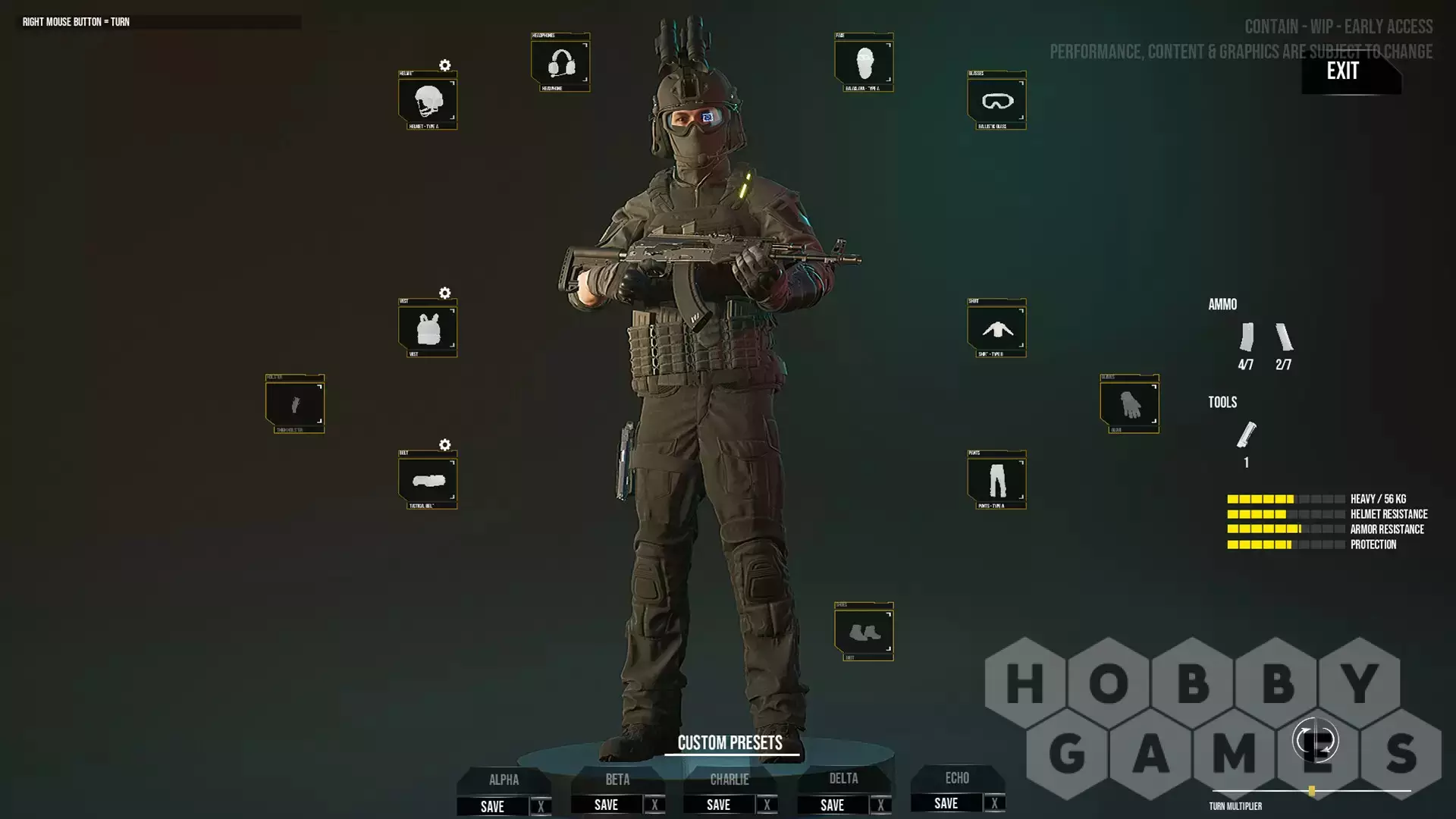Fully customize your character from basic outfit and gear to in-depth customization, you decide on every pouch and attachment placement.