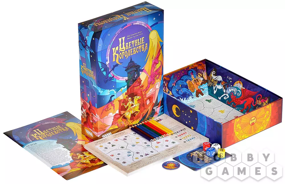 Игровое поле встроено прямо в коробку, так что, бросая кубики, вам не придётся переживать, что они разлетятся во все стороны. Раскрашивать королевства на своей карте – сплошное удовольствие, тем более, что яркие карандаши уже идут в комплекте. Продумывайте ходы, чтобы создать редкие составные цвета и набрать как можно больше победных очков и вернуть королевствам былую славу!