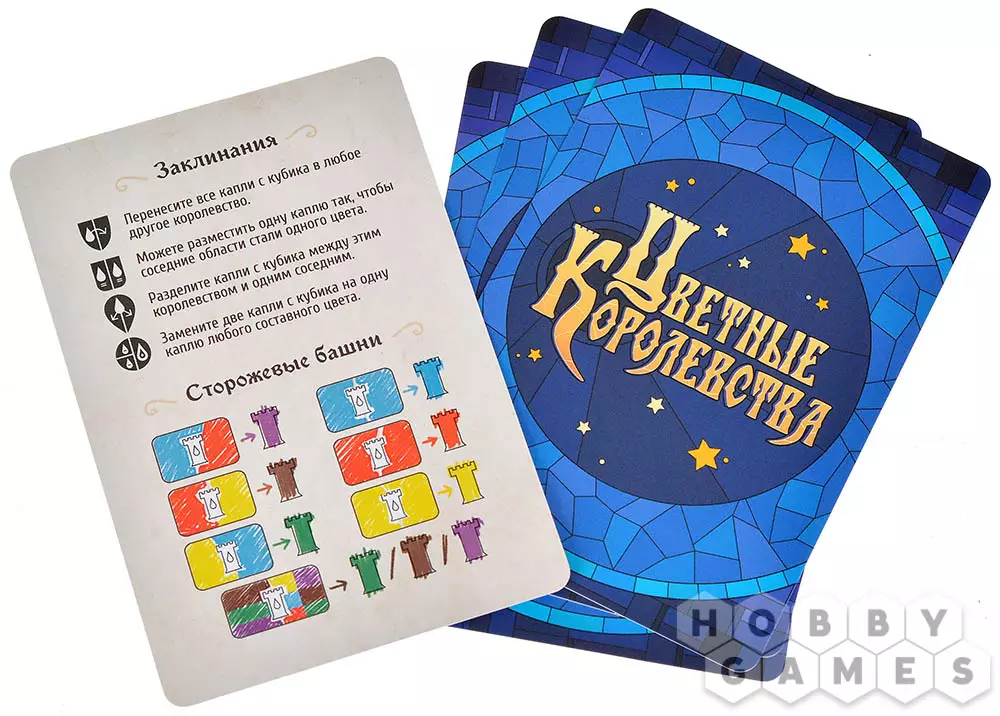 В начале раунда бросьте кубики на карту королевств – они определят, куда упали капли и какого они цвета. Выбирайте кубик и закрашивайте области на своём листе, используя базовые цвета (синий, красный, жёлтый) или создавая составные (фиолетовый, зелёный, коричневый). Закрашивайте столицы, чтобы получить дополнительные очки, побеждайте или приручайте чудовищ, используйте заклинания для нестандартных ходов и смешивайте краски в сторожевых башнях. Каждый раунд – это новые возможности и выбор: будете ли вы действовать быстро, чтобы опередить соперников, или копить ресурсы для мощного финального рывка?