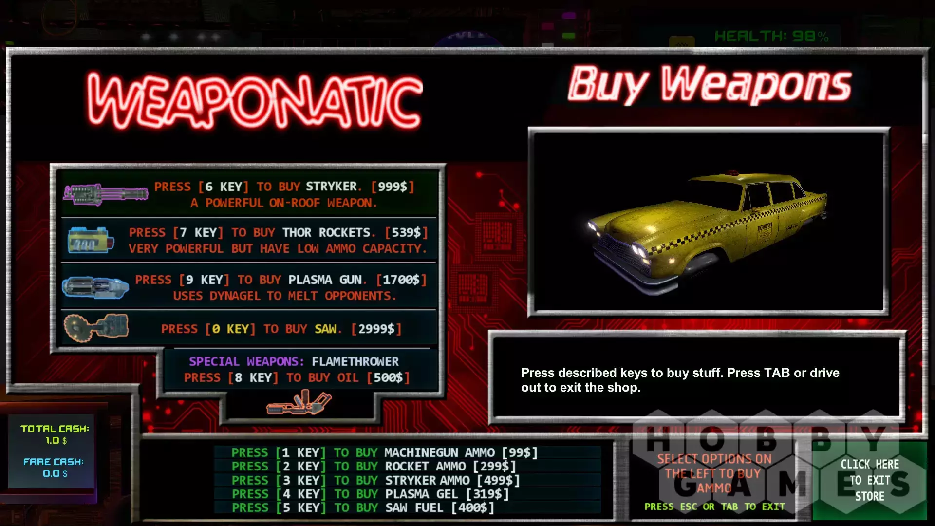 - Заработайте деньги, чтобы купить десятки видов оружия и починить свое такси!