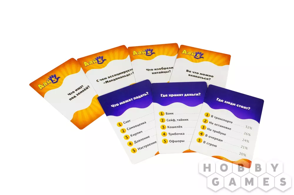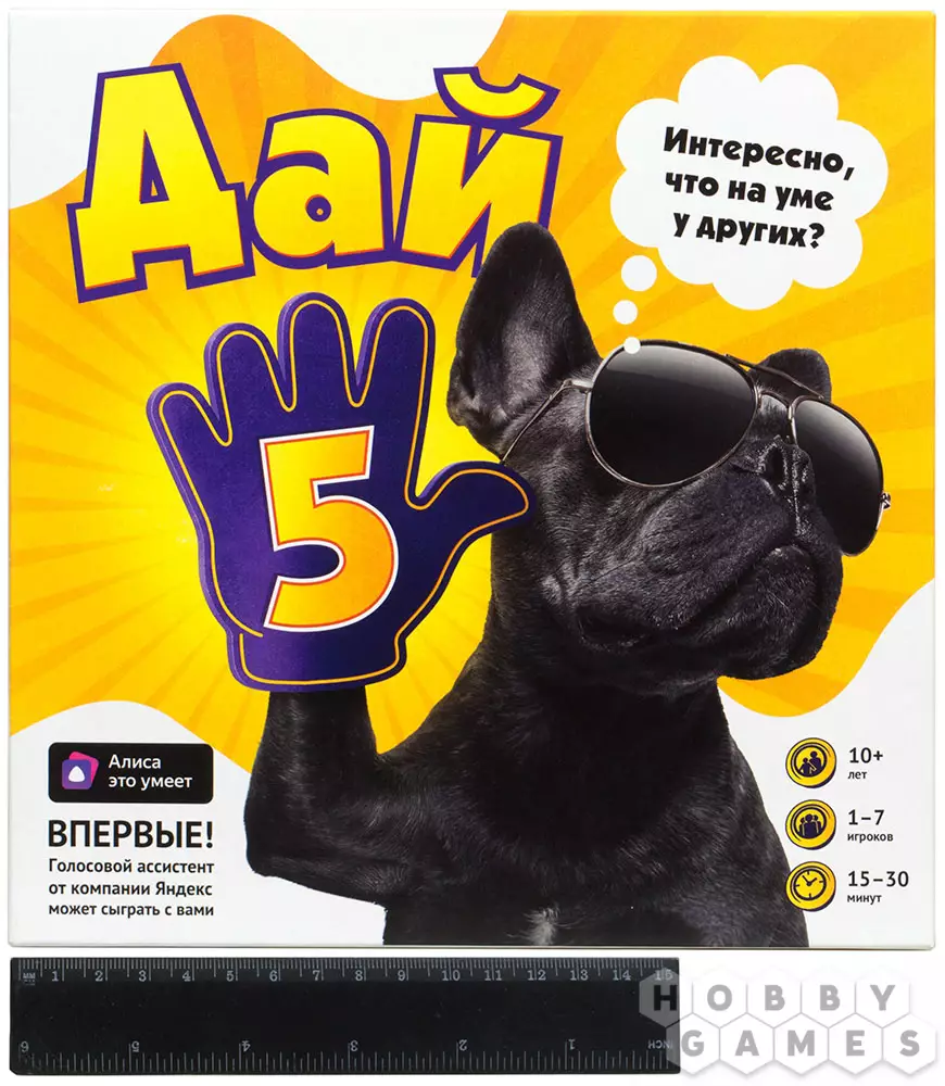 "Дай 5" – настольная викторина, в которой игрокам предстоит отгадывать наиболее популярные варианты ответов на различные интересные и местами странные вопросы. Игроки делают ставки, разыгрывают различные бонусные карты и получают монеты за правильные ответы на вопрос. Игра проста в освоении, чрезвычайно азартна и увлекательна, отлично подойдёт для игры с детьми. В неё можно играть большой компанией, поделившись на команды, можно играть одному или один на один по особым правилам.