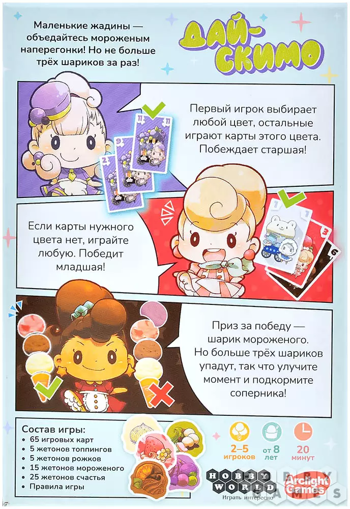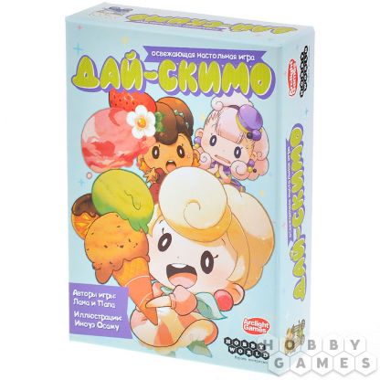 "Дай-скимо" – это динамичная карточная игра, где вы будете собирать на свой вафельный рожок аппетитные шарики мороженого самых разных вкусов и цветов. Эта настолка не заставит вас скучать – правила осваиваются за минуту, а партия пролетает весело и динамично. Красочные иллюстрации от японского иллюстратора, милые жетоны мороженого и простая механика делают её идеальным выбором для семейного досуга, встречи с друзьями или даже игры в путешествии.