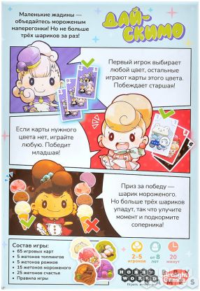 Почувствуйте сладкий азарт и вкус победы в настольной игре "Дай-скимо"! Это соревнование самых настоящих любителей мороженого, где каждый ход – это гонка за вожделенным шариком, а каждый раунд – это риск и расчёт.