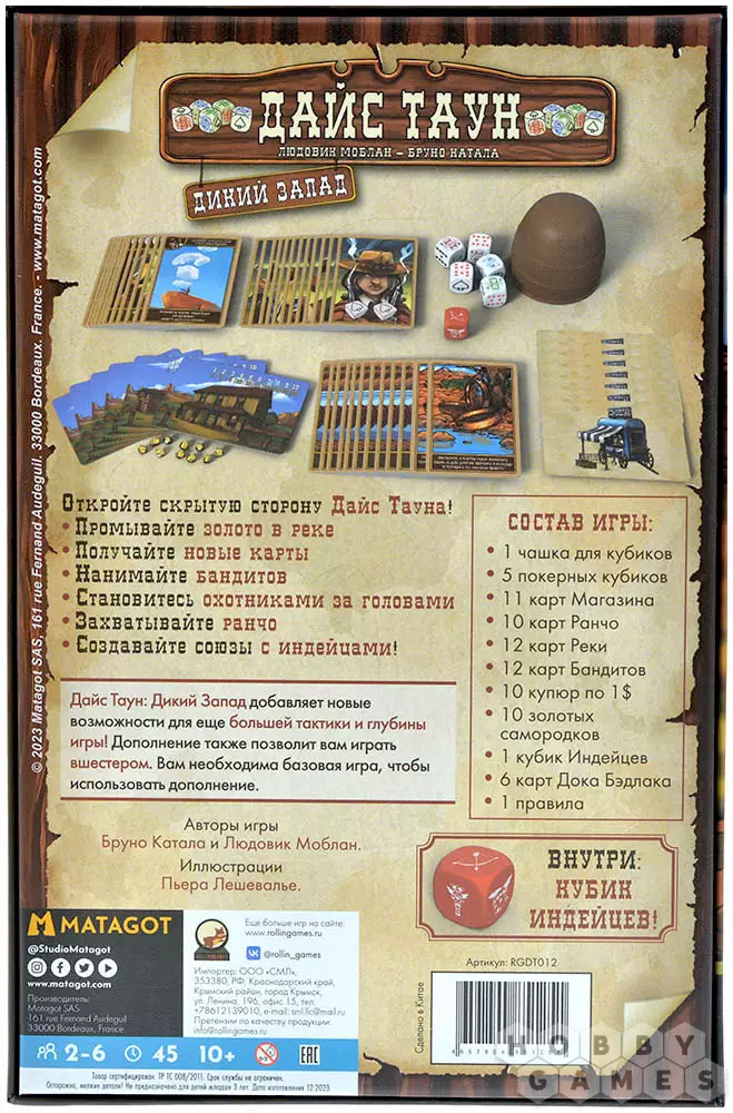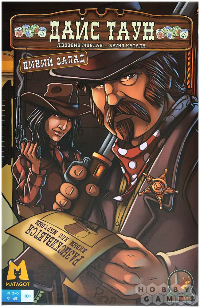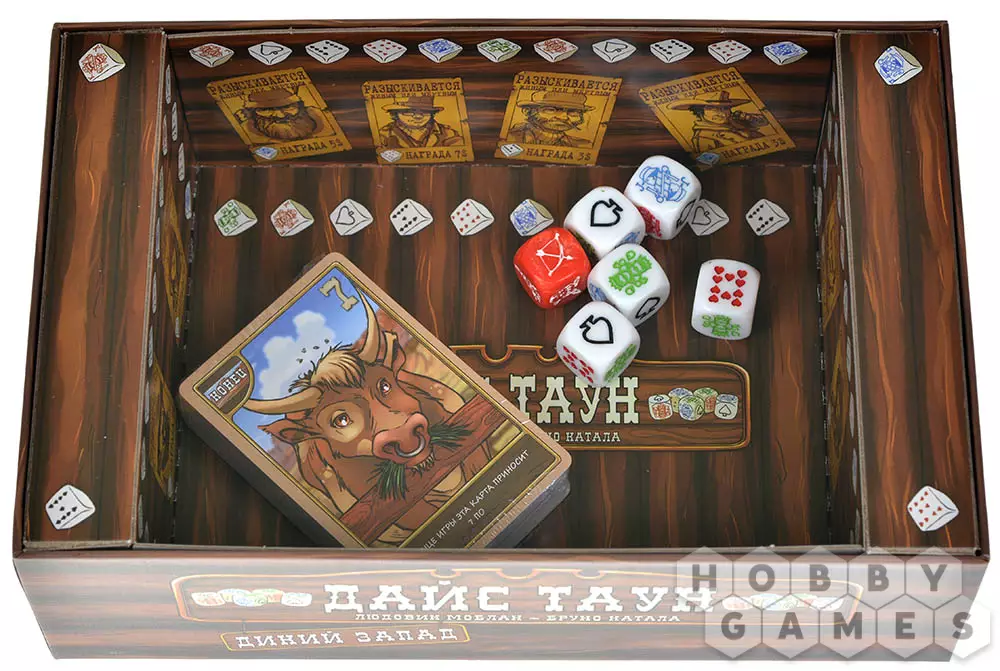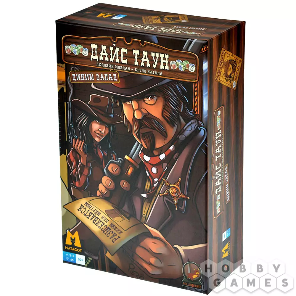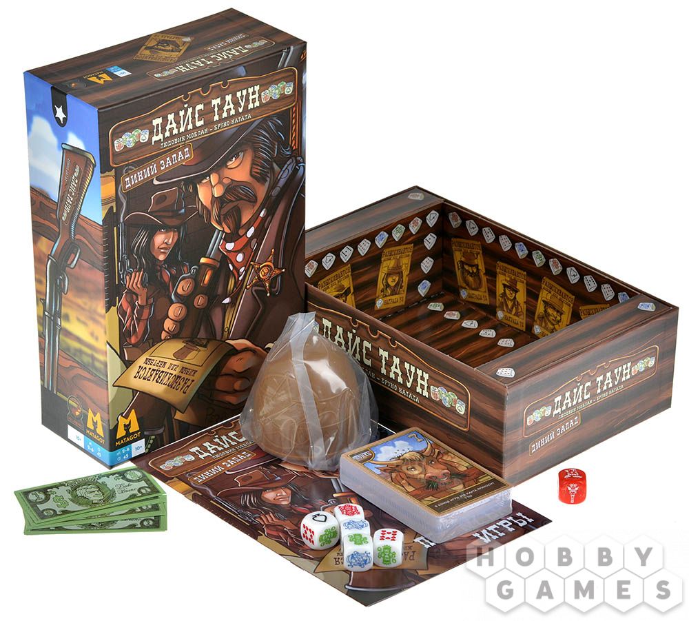 "Дайс Таун: Дикий Запад" – это расширение, которое позволит вам по-новому взглянуть на оригинальную игру. Приготовьтесь к ещё большему количеству богатства, развлечений и стратегии! Добывайте золотые самородки в реке, приобретайте невиданные ранее товары, вербуйте бандитов или устраивайте за ними слежку, управляйте ранчо и заключайте союз с индейцами. Также это дополнение позволяет увеличить число игроков до 6, добавляет городским локациям выбор из двух действий, а в конце игры может объявить двух победителей!
