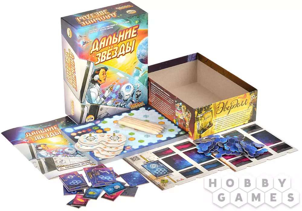 "Дальние звёзды" – это увлекательное путешествие, по итогам которого каждый игрок составит свою карту космоса! Во время исследования вы встретитесь с инопланетными расами, откроете новые скопления ярких звёзд, отыщите сокровища неисследованных ранее планет и постараетесь избежать опасные чёрные дыры. Рисуйте уникальный маршрут на своей карте космоса, используя направления с жетонов зон разведки. Но какой путь будете рисовать вы, а какой остальные игроки, зависит от выбранного вами модуля. Действуйте с умом, и ваша карта обязательно приведёт человечество к новым высотам!