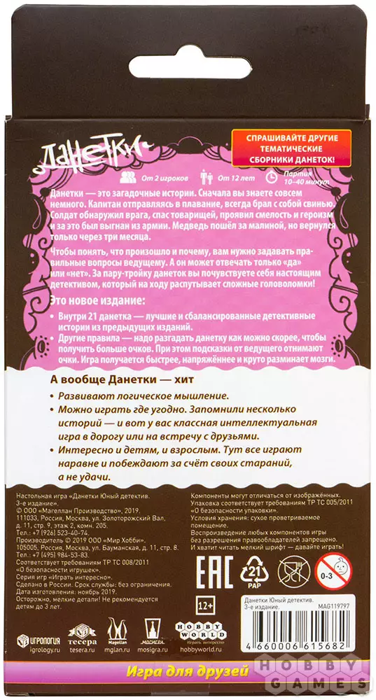Данное издание содержит 21 задание средней сложности, которые вполне будут под силу юным детективам школьного возраста, но, уверены, что далеко не каждый взрослый сможет сразу раскусить этот крепкий орешек. Так что собирайтесь все вместе, загадывайте и угадывайте, но не забывайте следить за временем, ведь в компании с "Данетками" оно летит незаметно!