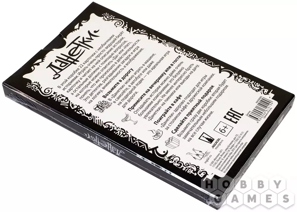 Настольная игра "Данетки" ставит задачу одним предложением, а игрокам необходимо наводящими вопросами узнать решение и дать ответ. На чёрно-белых картах изображены великолепные иллюстрации и занимательные истории, которые вам ещё предстоит узнать.