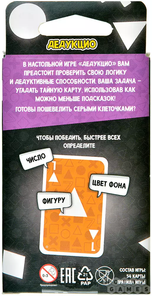 "Дедукцио" – логическая карточная игра, в которой игроки стремятся отгадать тайные карты. Правила довольно просты – и за этой простотой кроется настоящий вызов вашим дедуктивным навыкам!