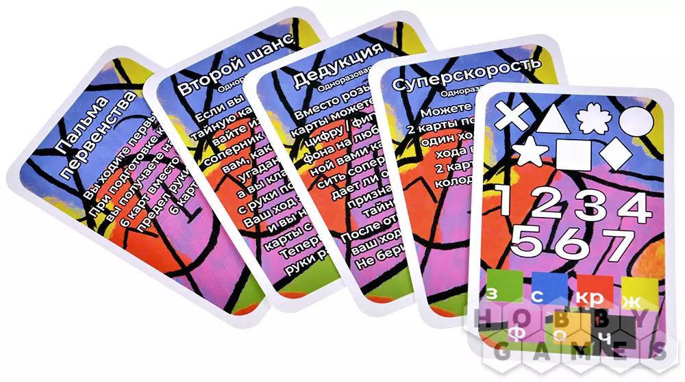 В начале игры каждый игрок берёт пять карт. Они отличаются по трём признакам: цвету фона, фигуре и цифре. И сразу после этого начинается интересное: все игроки получают тайные карты! Их тоже необходимо взять в руку – но обратной стороной. Таким образом, игрок, которому принадлежит карта, видит лишь её рубашку, в то время как для остальных игроков эта карта открыта.