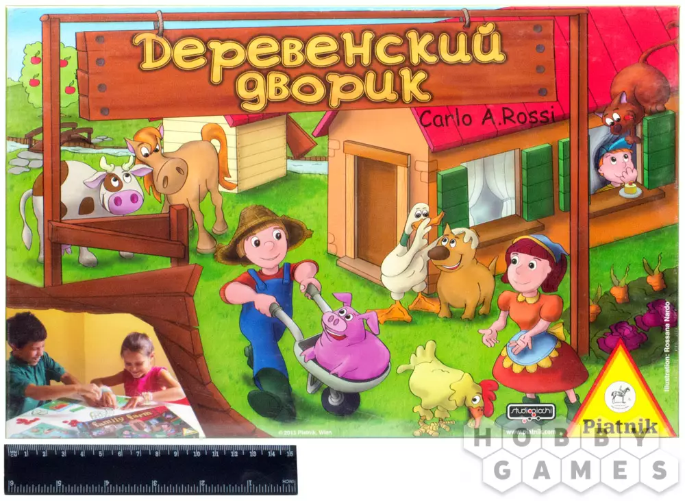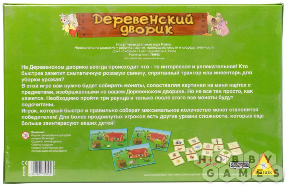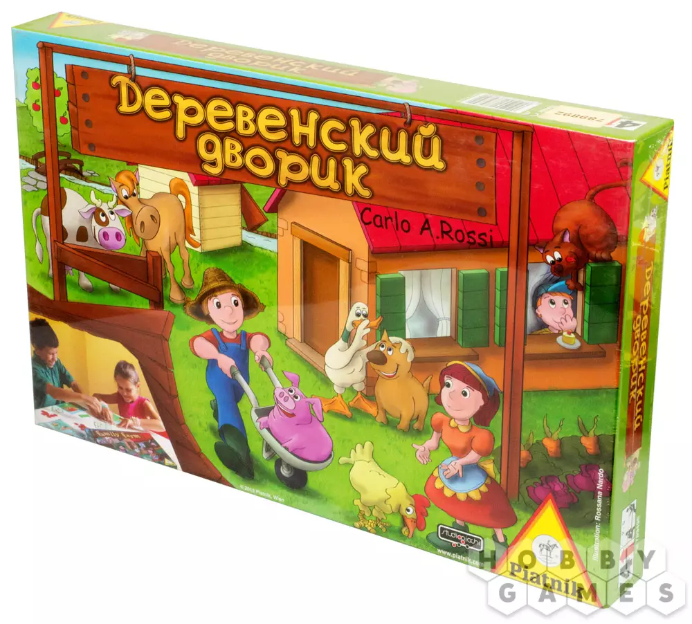 "Деревенский дворик" – это детская настольная игра на внимательность и скорость реакции. Вместе со своей семьёй и лучшими друзьями мы отправляемся на природу, а конкретнее – на бабушкину ферму, где ей может потребоваться наша помощь! Бабушка плохо видит, так что и заниматься нам предстоит в основном поиском различных предметов: то любимая кошечка прячется где-то, то срочно понадобилась лейка для полива цветов. За каждое успешное задание бабушка будет награждать вас монеткой – вот уж можно будет мороженого наесться!