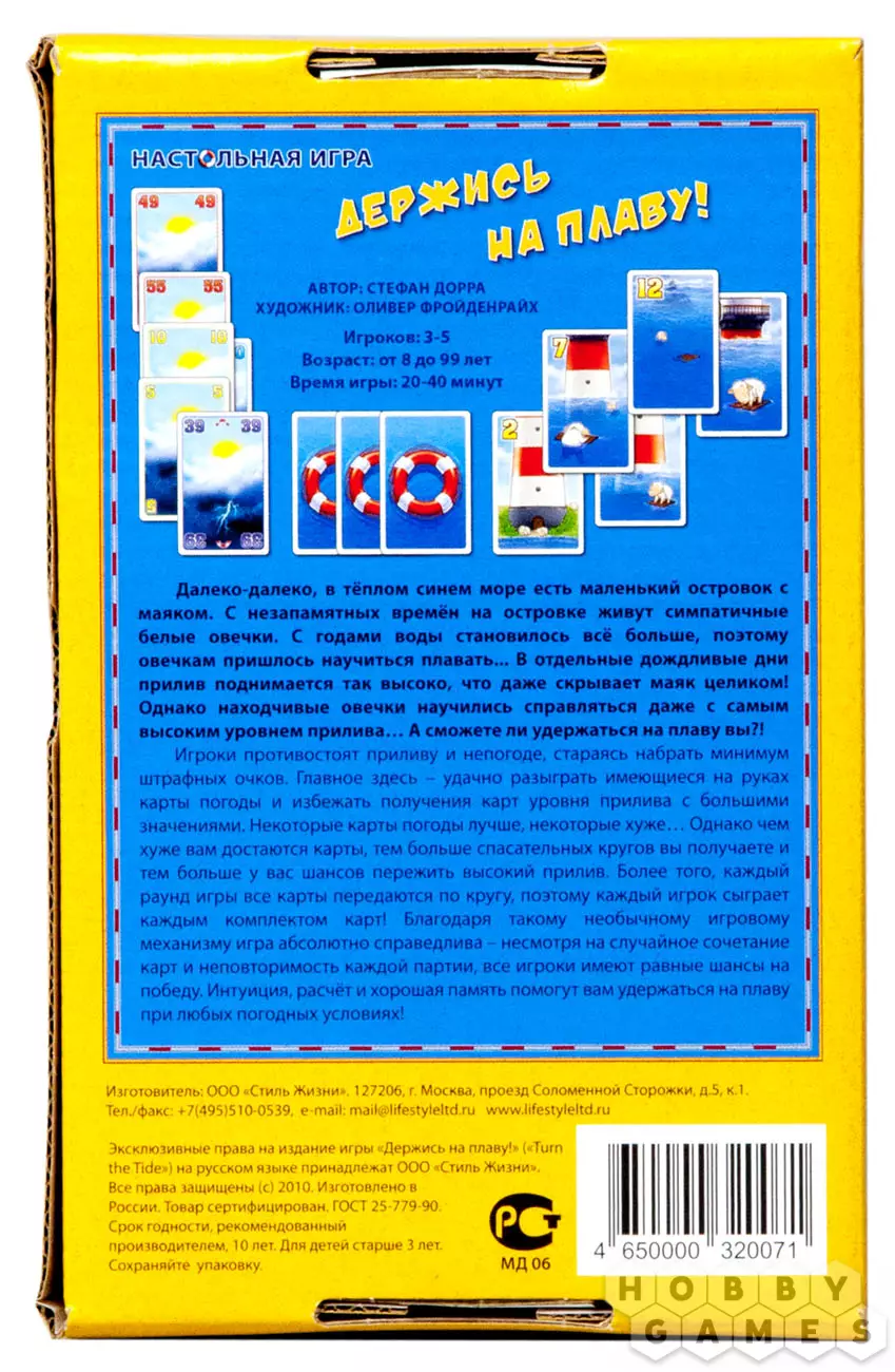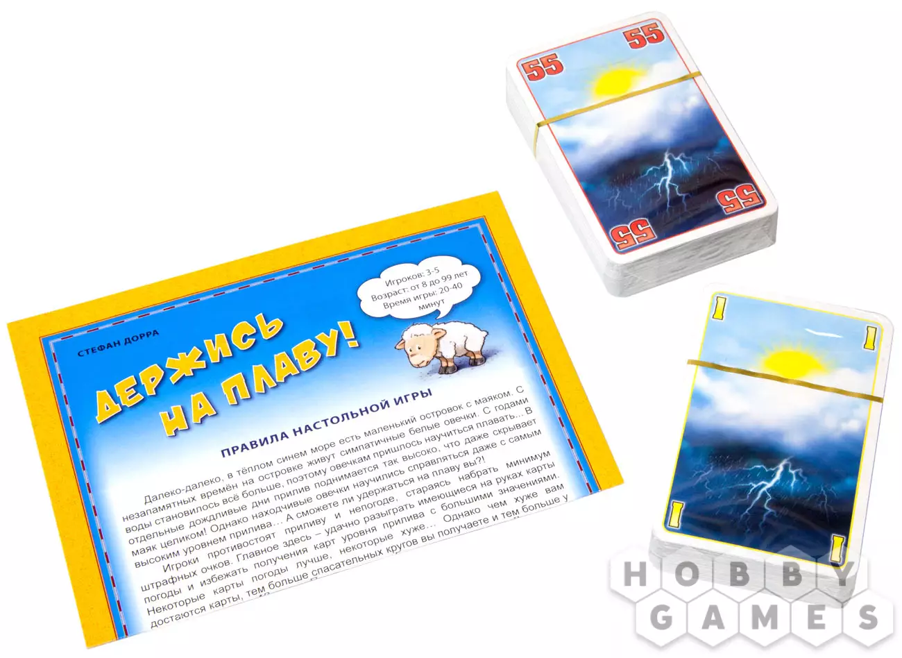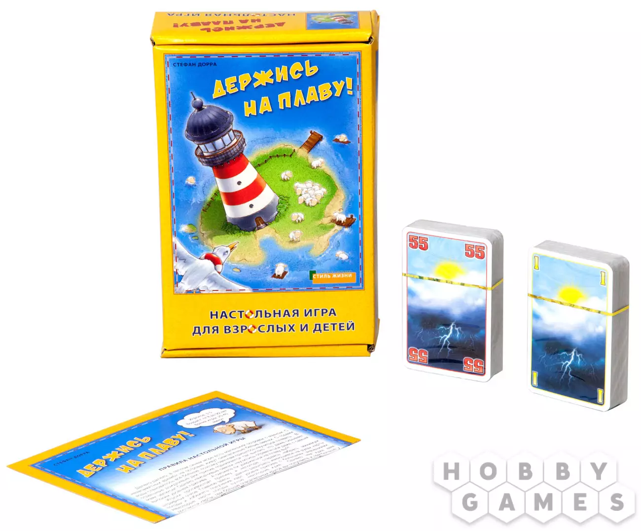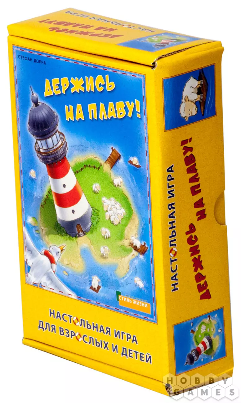 "Держись на плаву!" — спокойная и размеренная настольная игра, которая отлично подойдёт для любой компании. В игре вам придётся играть за милых овечек, живущих на небольшом острове с маяком, которым, в силу плачевных обстоятельств, пришлось научиться плавать.