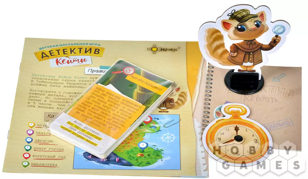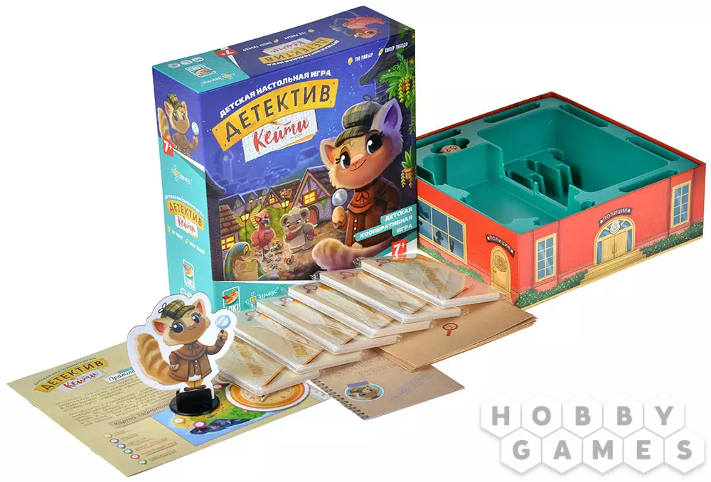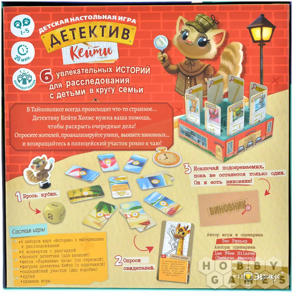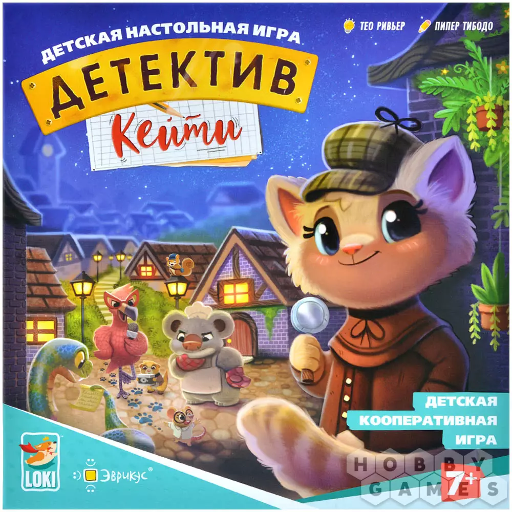 "Детектив Кейти" – это кооперативная игра для детей, в которой игроки станут самыми настоящими сыщиками! Они будут опрашивать местных жителей, осматривать места происшествий и собирать информацию воедино, чтобы решить запутанную загадку. Сложность каждого дела рассчитана специально для юных игроков, однако и взрослым любителям детективов тоже будет чему удивиться! Собирайте команду и приступайте к делу!