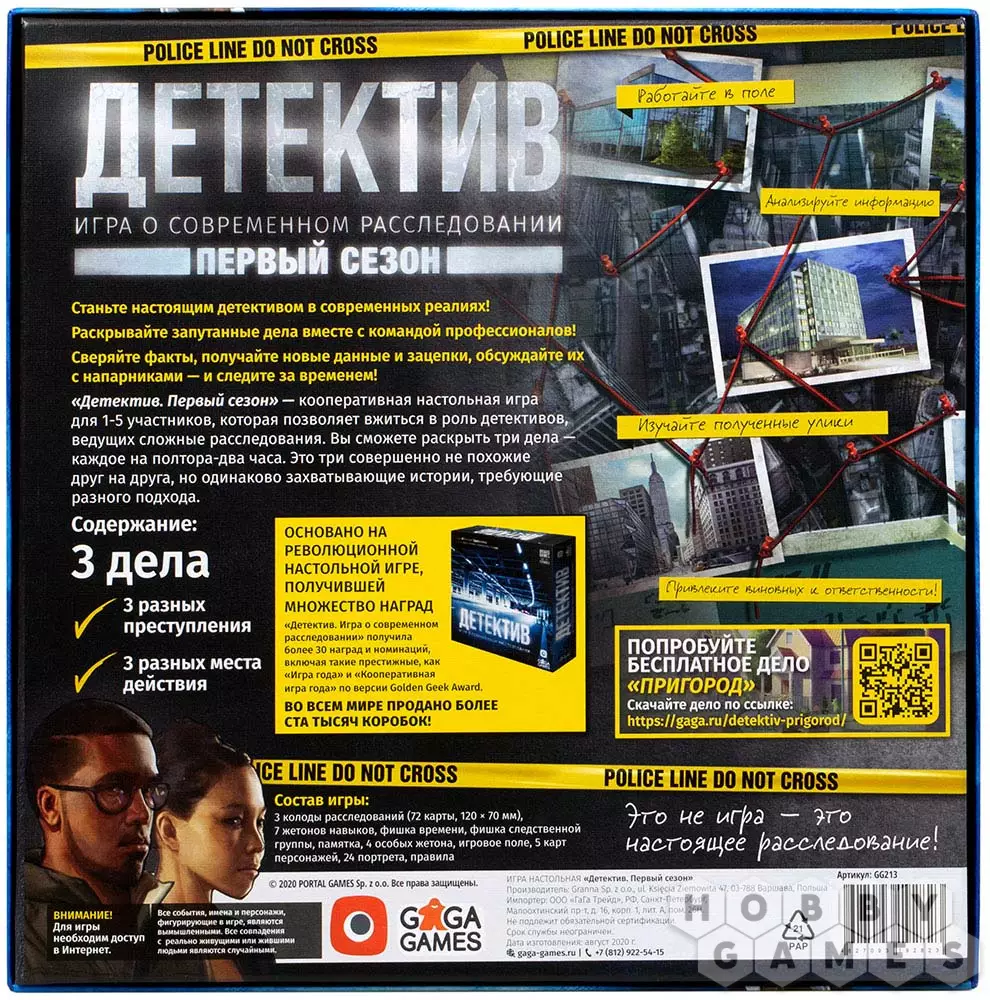 "Детектив. Первый сезон" погрузит вас в нуарную атмосферу современного расследования. Эта серия симуляторов работы детектива хорошо принята игровым сообществом: Detective: A Modern Crime Boardgame была номинирована на Golden Geek Awards в четырёх категориях, а жюри As d'Or признало её лучшей игрой для экспертов. "Детектив. Первый Сезон" – самостоятельная игра, которая идейно продолжает серию, но продолжает развиваться. Правила игры немного изменились: партии стали короче, а каждое дело теперь сюжетно не связано с остальными. Это позволяет играть в разные расследования с разными людьми, не объясняя, что происходило до этого. Работайте в команде, старайтесь мыслить как можно более логично, будьте внимательны и не упускайте мельчайших деталей расследования – ложные гипотезы могут завести в тупик, а каждая секунда может оказаться решающей. Новые дела ждут, за работу!