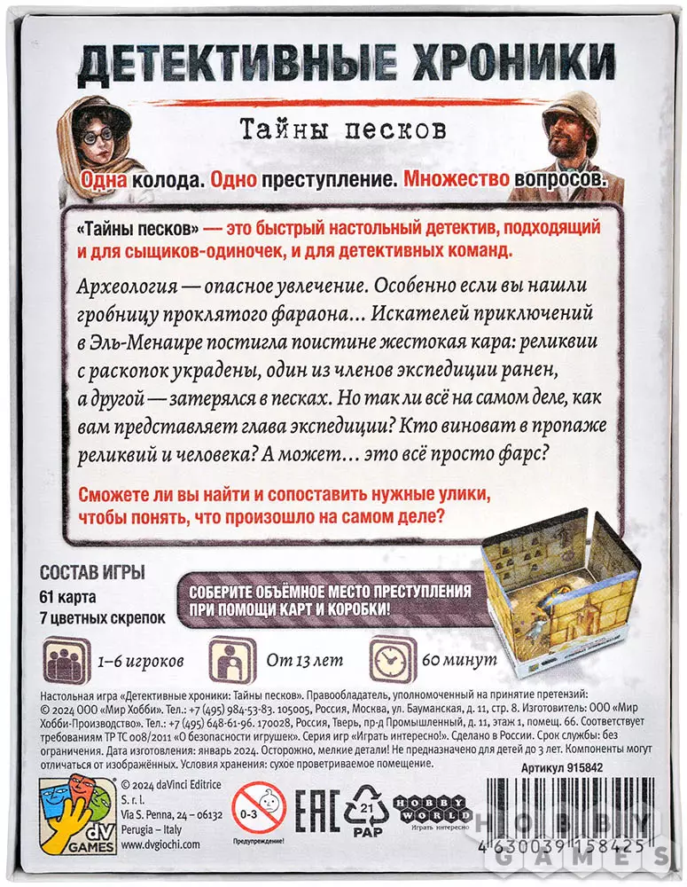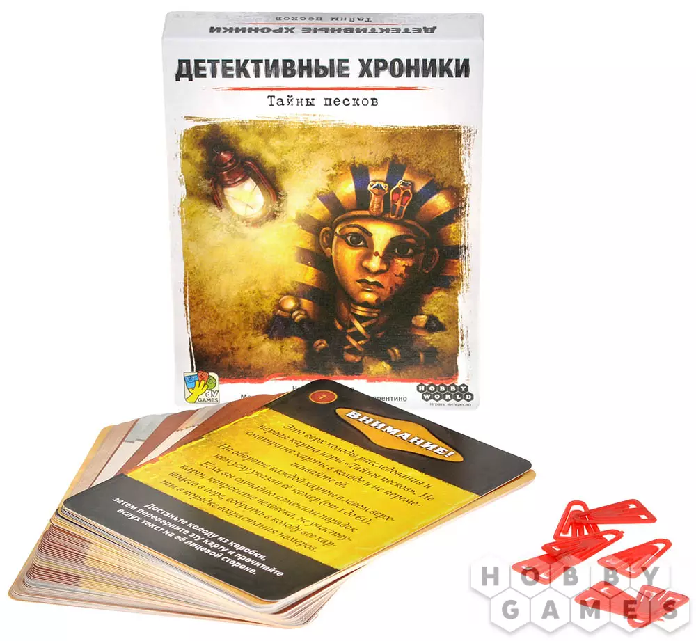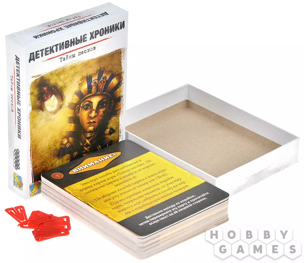 "Детективные хроники: Тайны песков" – это игра о совместном расследовании, в которой рассказывается о произошедшем преступлении. Игроки должны сообща раскрыть загадочный случай. Они разыгрывают свои карты, чтобы делиться информацией, сбрасывают карты, которые, по их мнению, приведут их в неправильное русло, обсуждают найденные улики, делают гипотезы и выводы, чтобы найти решение!