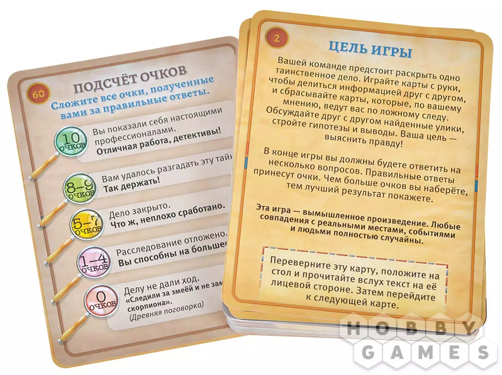 Колода карт расследования кладётся в центре игрового стола. Карты в колоде нельзя перемешивать и подсматривать, игра начинается с верхней карты. Прочитайте текст на первой карте. В начале игры участники соберут из коробки объёмное место преступления, а далее игра сама расскажет вам, что делать дальше, и в какой последовательности.