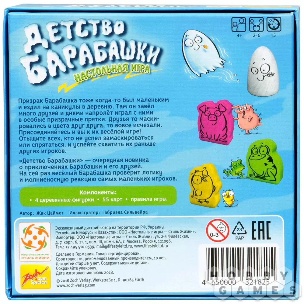Правила настольной игры "Детство Барабашки" очень просты, а игровой процесс развивает реакцию и внимательность у детей. Тянем карту и смотрим на картинку, кто из друзей изображен на картинке и раскрашен в свой цвет, того и стараемся ухватить со стола. Попались! Выбрав правильную фигурку, игрок получает карточку, кто наберёт больше всех, тот и победил.