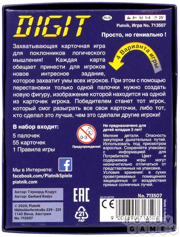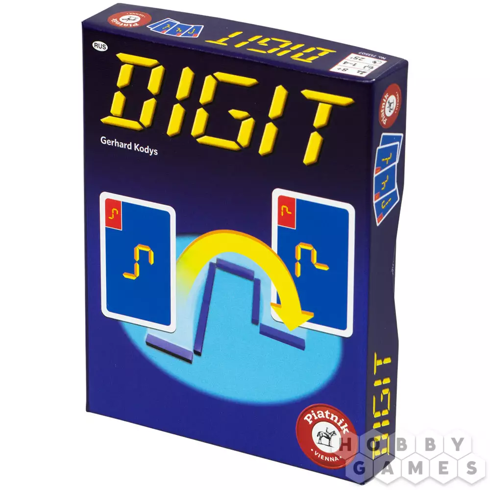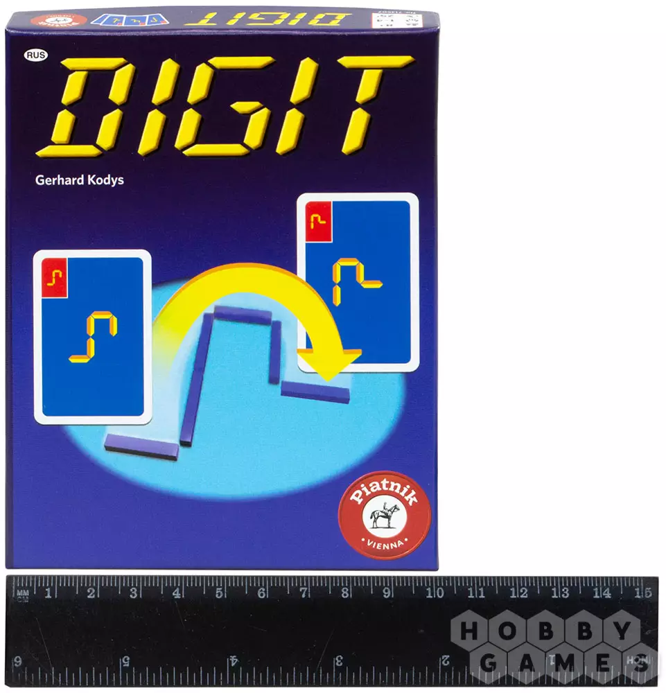 Digit – это настольная игра с простыми и понятными правилами, для которой вам не потребуется много места или времени. Играть в Digit нужно с помощью входящих в игровой комплект карточек и палочек. В начале игры вы получаете пять карточек, на которых изображена необходимая комбинация палочек. Положить карточку на стол и избавиться от неё вы сможете только если комбинацию палочек на вашей карточке можно получить из той, что сейчас на столе, передвинув лишь одну из палочек. Если же вы не можете положить карту, то вам придётся взять дополнительную. Тот, кто избавится от всех карт, побеждает. Внимательно следите за комбинациями палочек и не упускайте возможности – победа может достаться именно вам!