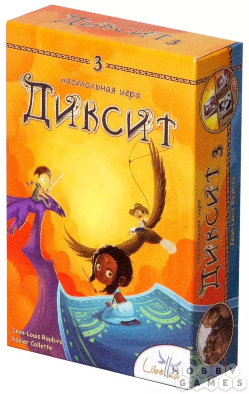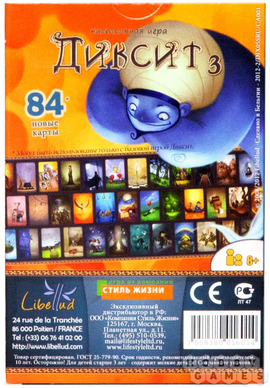 «Диксит 3» – это дополнение к настольной игре «Диксит» и «Диксит Одиссея». Эта колода привносит в эту удивительную игры свежие образы и ассоциации, делая процесс игры еще разнообразнее и интереснее. В этой колоде представлены новые карты в количестве 81 штуки, на которых изображены фантастические и сюрреалистические произведения художественного искусства. Эти карты можно использовать с компонентами базовой игры для большего разнообразия, но есть возможность играть и только этим набором, однако в нем нет жетонов, поэтому игрокам придется самим придумать способ подсчета очков.