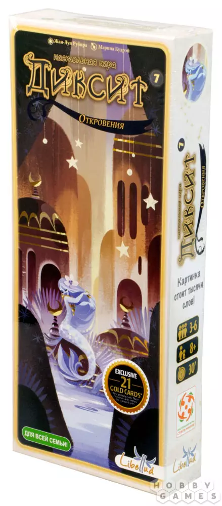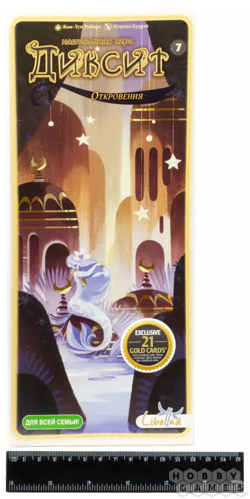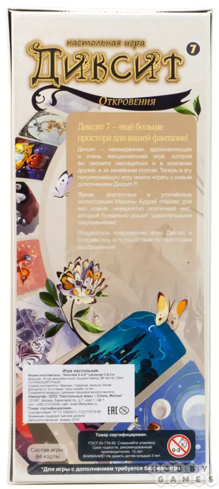 Это дополнение к волшебной игре "Диксит". Внутри вас ждут 84 фантастические иллюстрации от нового художника Marina Coudray. Сам набор карт получил название "Откровения".