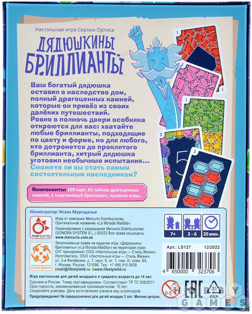 Весь следующий раунд обладатель проклятого бриллианта обязан выполнять задание, которое написано в карте проклятий. По итогам 5 раундов участники игры подсчитывают очки и объявляют победителя в этой гонке драгоценностей. Игра подходит для всех возрастов, не требует долгой подготовки, является хорошей разминкой для ума и тела.