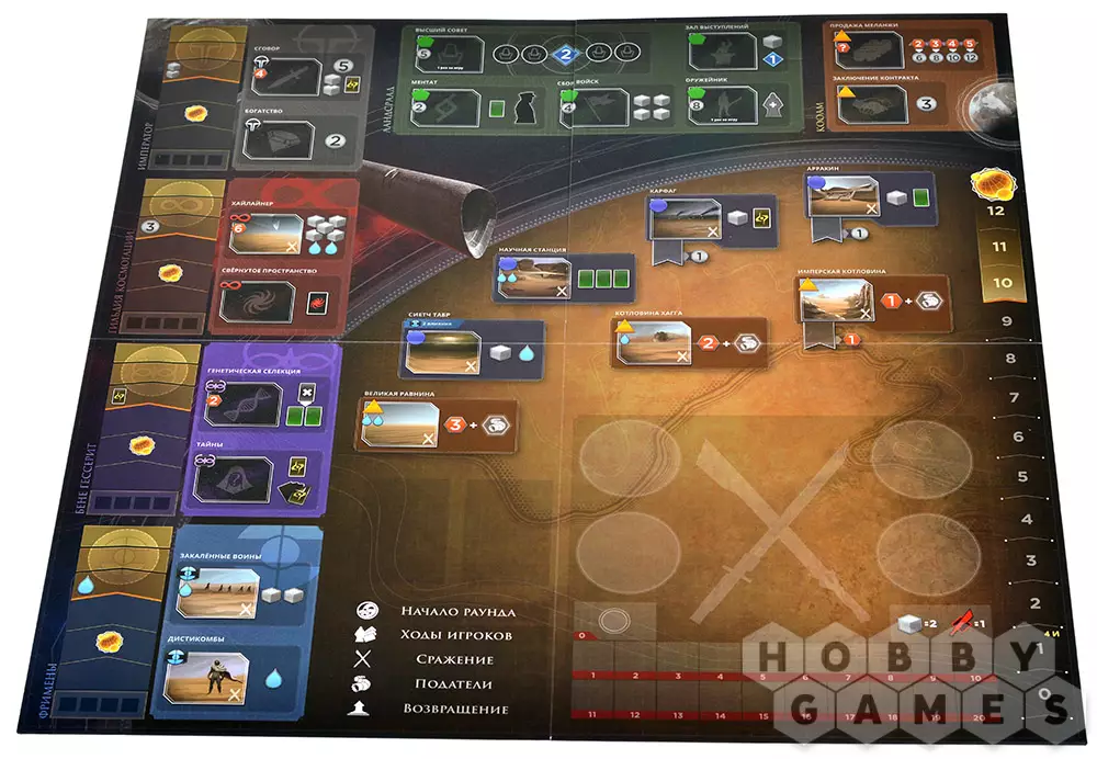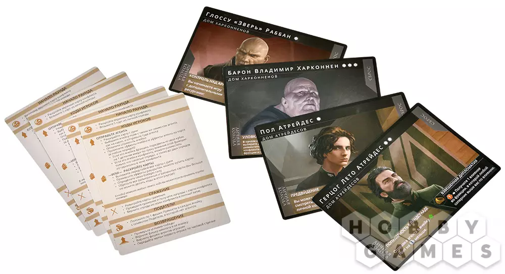 У каждого игрока своя неповторимая колода карт, используя которую контролируются события Дома. Карты символизируют различные предметы и героев, ситуации, оказывающие влияние на борьбу за Пряность. Игроки сами вершат судьбу своего Дома и историю, при помощи уникальных способностей и талантов. Игра состоит из 10 раундов, и завершается, когда один из претендентов на трон получает 10 победных очков. Захватите территории и станьте главным на этой пустынной планете!