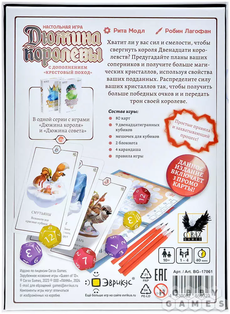 "Дюжина королевы" – настолка, где ключевую роль играют стратегическое мышление и способность угадывать наперёд, как именно будут действовать ваши оппоненты. В процессе вы будете распределять силу волшебных кристаллов, представленные разноцветными кубиками D12. Для этого вы будете использовать карты своих персонажей и применять те или иные значения на поле. Заполняйте ячейки самым выгодным образом и набирайте заветные победные очки. Тут вам наверняка потребуется не только удача, но также хитрость и расчётливость.