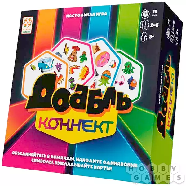 "Доббль: Коннект" – это увлекательная игра, требующая быстрой реакции и внимательности. Вы можете играть как в команде, так и в одиночку, но принцип остаётся прежним – найти совпадение на двух карточках быстрее всех. Постарайтесь выложить 4 карты своего цвета в ряд, чтобы одержать победу в раунде. И самое интересное, что в "Доббль: Коннект" творится полный хаос, отсуствует очередность ходов, все игроки действуют одновременно!