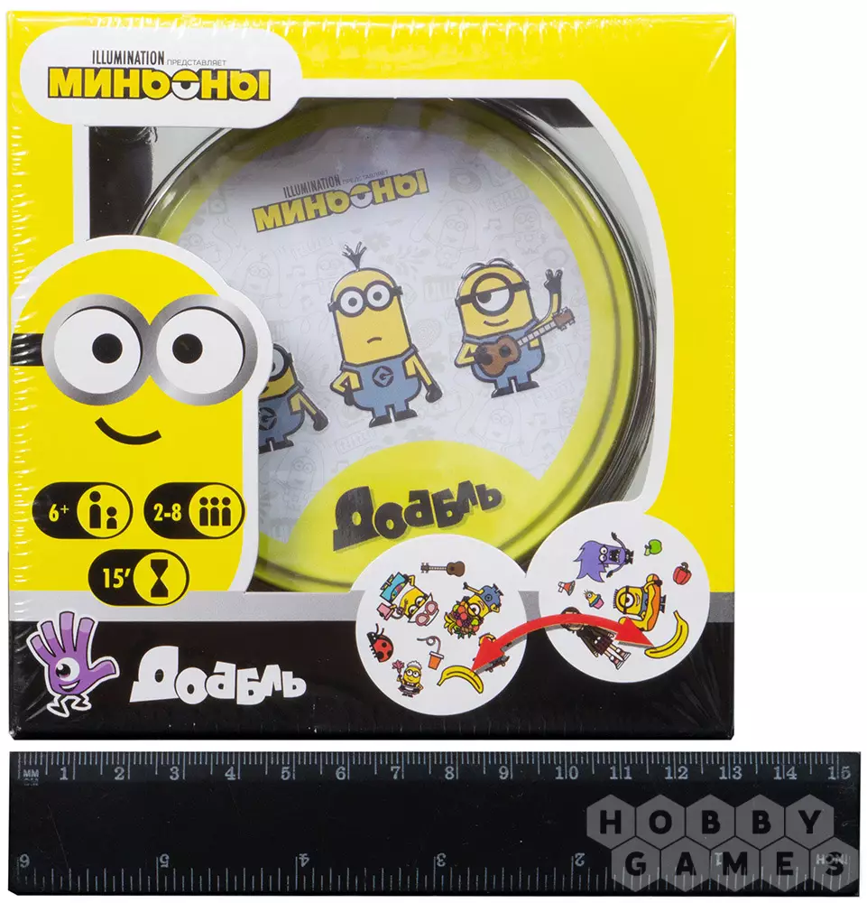 "Доббль: Миньоны" – это настольная карточная игра для детей или всей семьи с простыми и забавными правилами. Игра испытывает вашу скорость реакции и внимательность, ведь для победы вам нужно как можно скорее находить карточки с совпадающими символами. Все миньоны похожи, но отличаются в каких-то мелочах. Сможете быстро различить их?