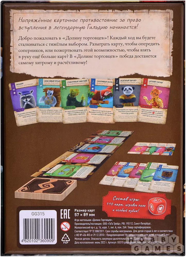 В игре "Долина торговцев" вы возьмёте роли купцов, что соревнуются за право вступить в гильдию. Под вашим началом окажутся торговцы шести разных народов: приспосабливающиеся хамелеоны, предприимчивые панды, плутоватые еноты-полоскуны, дерзкие ара, запасливые белки-летяги и везучие оцелоты! Каждый из них ведёт дела в своей манере: одни полагаются на красноречие и деловую хватку, другие – на уловки и подлости. На старте всё, что у вас есть – скромный прилавок, небольшой запас особых приёмов вашего народа и природное обаяние. Цель – собрать на своём прилавке 8 полок, прежде чем это сделают другие торговцы.
